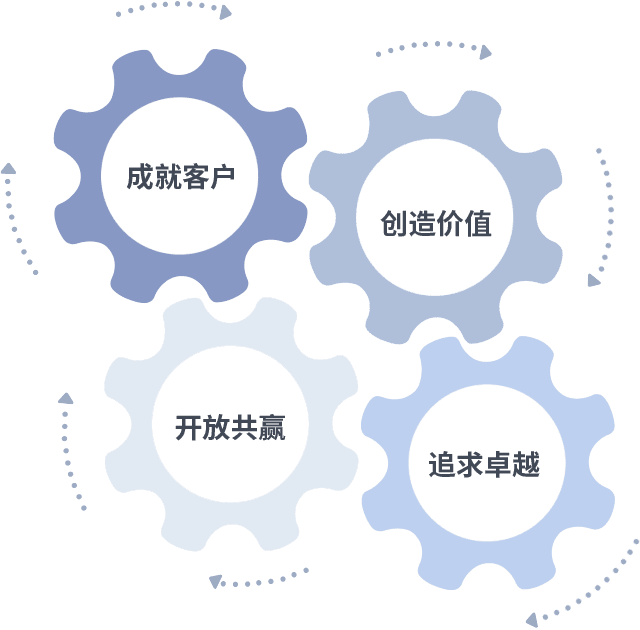 成就客户是一切决策的出发点,,创造价值是衡量所有工作的标准,,,追求卓越是我们做事做人的态度,,开放共赢是我们的格局也是最终的结果。。。价值观的齿轮环环相扣,,推动着组织里的每个人不断向前。。。