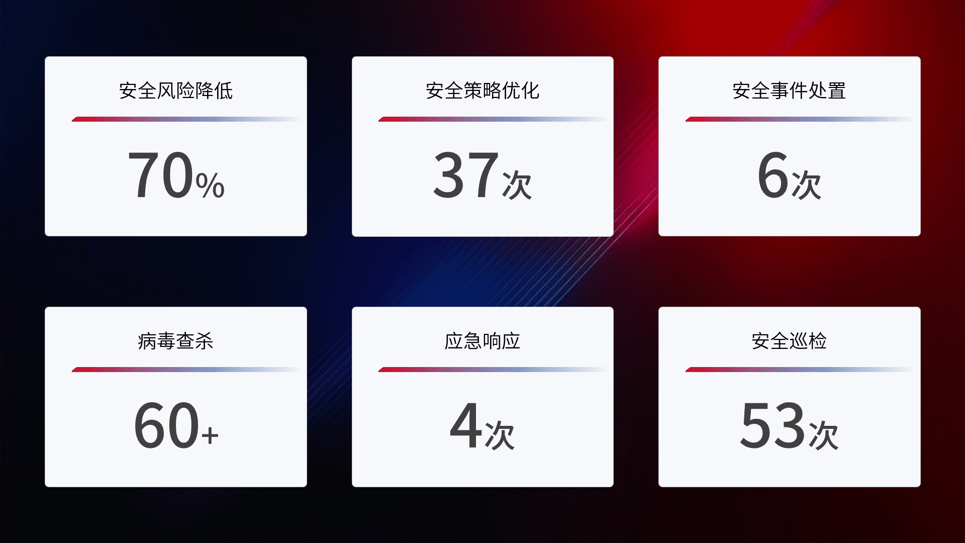 提供全面的安全事件报告体系,,,包括处置报告、、周报、、、、季度和年度总结,,,,结合持续监控,,帮助客户深入了解网络安全状况。。。
