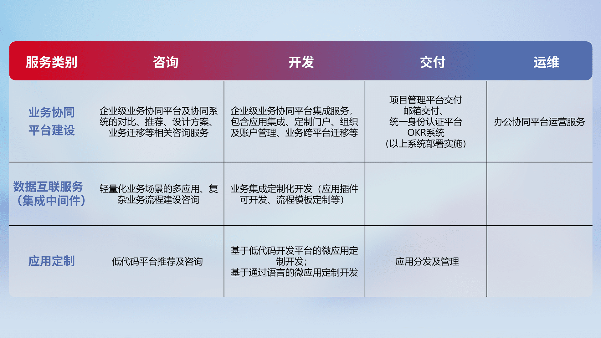 针对钉钉、、企微、、、IDaas等平台级产品提供产品的规划、、方案、、、、交付、、定制化开发等服务,,,,实现如统一协同办公、、、、智能客户服务、、、、混合会议管理、、、、智能数据查询、、等业务场景,,,实现数字化转型。。。。
